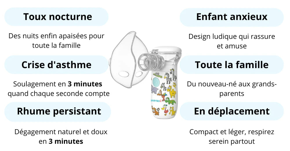 Selon Ameli.fr, l’aérosolthérapie par nébuliseur fait partie des solutions utilisées pour soulager les troubles respiratoires chez le nourrisson et l’enfant, notamment en cas de toux ou de gêne respiratoire.